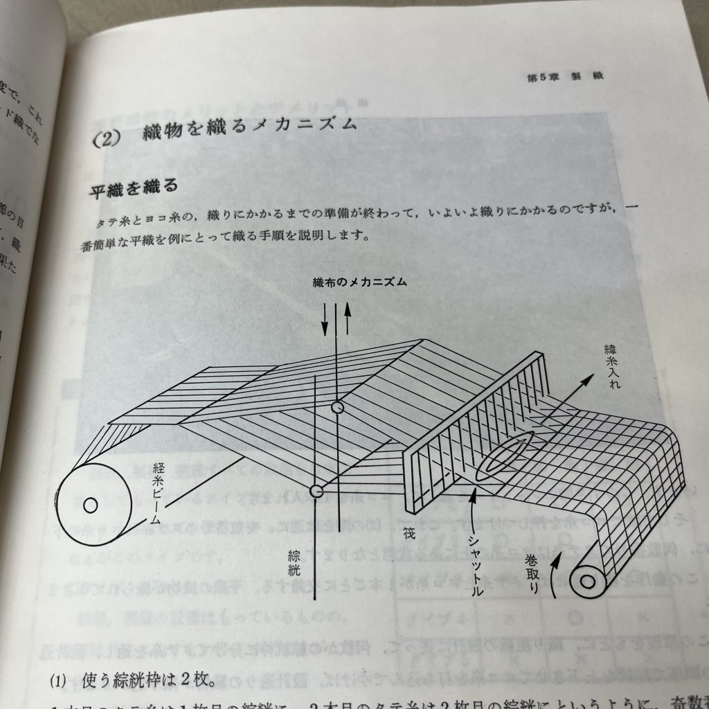 縦糸をセッティングする綜絖(そうこう)という2枚の枠が上下に動くことで、その間を横糸のシャトルが流れ、生地を織り進めるのが製織(せいしょく)の仕組み。