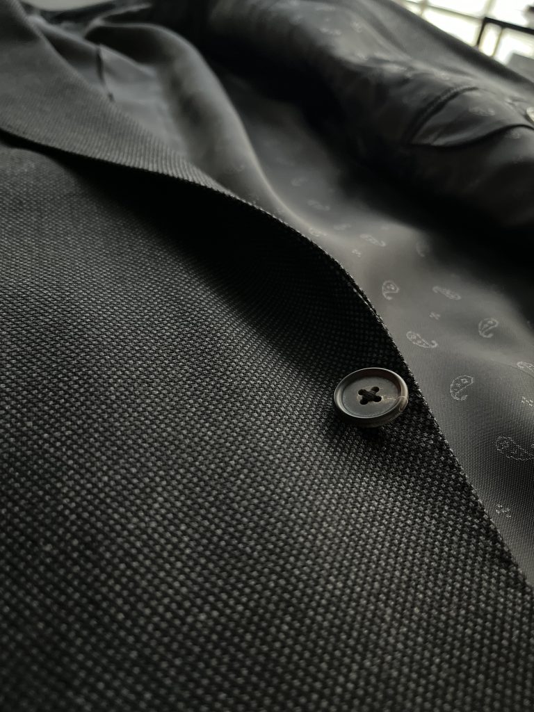 本作は、秋冬シーズンの古典かつ定番のバースアイを表地に採用した、フロント1釦のスーツ。