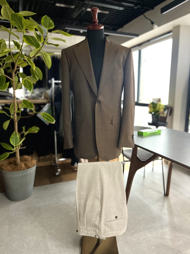 トラウザーズの服地は、同じくアースカラーかつ爽やかな色味を主軸に置いたご提案に。