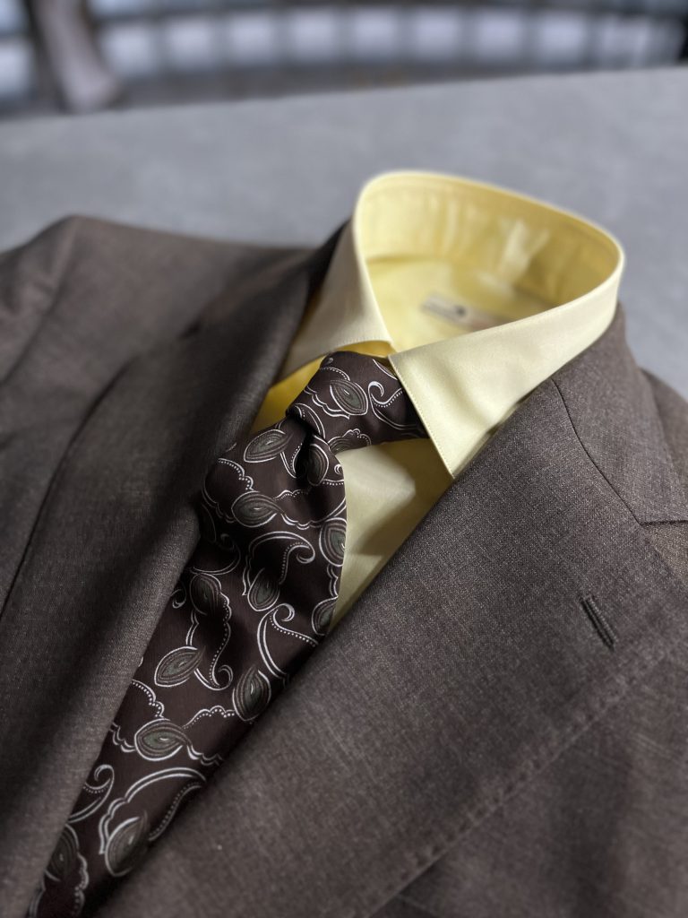 そしてビタミンカラーよりのシャツ生地と、当店で取り扱う Albeni 1905 のネクタイをコーディネート。