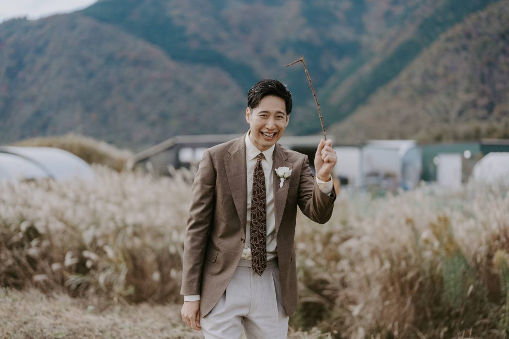 しかし年々、TPOの必要性を感じている。そんなステータスでしたので、手持ちのコットンパンツなどにもコーディネート可能な1着を目指し、一義的には、新郎然とした装いと山梨の大地に調和するアースカラーをご提案。