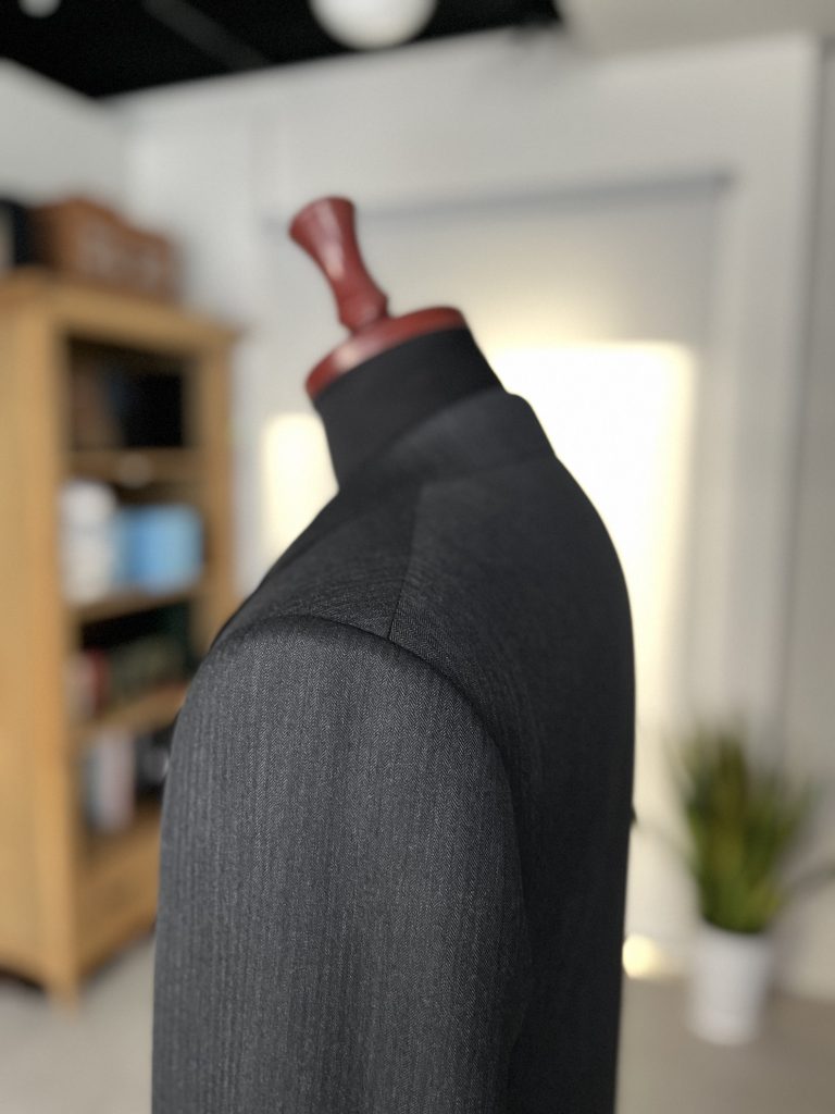 MTM – House cut では、当店の技術と世界観をしっかりと表現することも重要になりますが、技術面でのアイコニックに肩線のセットバックが挙げられます。