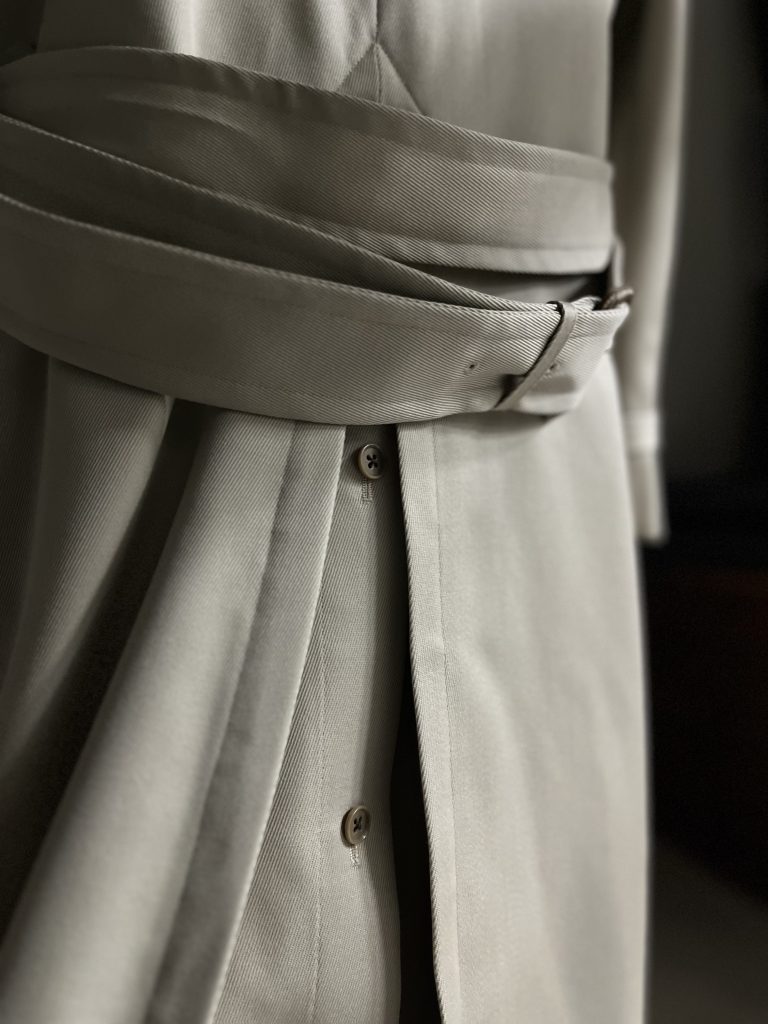 毛質の太い21マイクロンは、私が求めるトレンチコートの無骨さに合致しながらも、上品な光沢とドレープ、そして強靭な物性は、非常に満足のいく仕立て上りになりました。