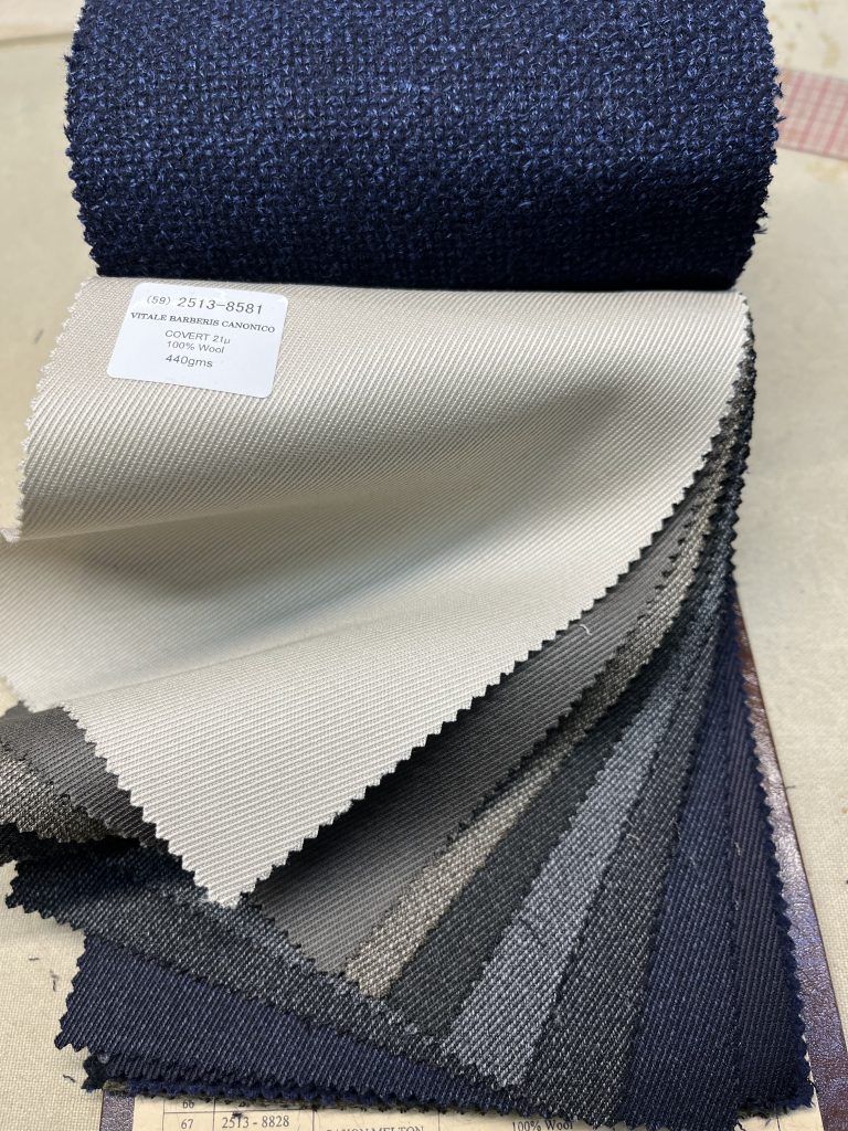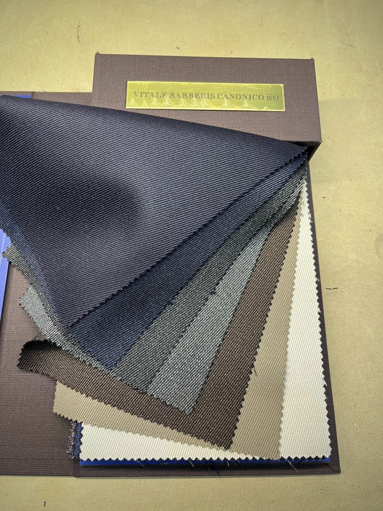 ヴィターレ・バルベリス・カノニコ社の21マイクロン・カバートクロスは、耐久性と防シワ性に優れ、独特の光沢とスモーキーな表情が特徴の綾織り生地。