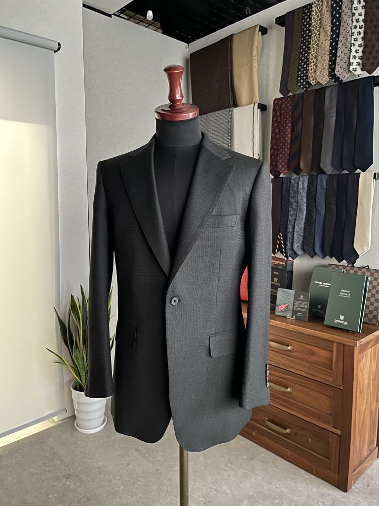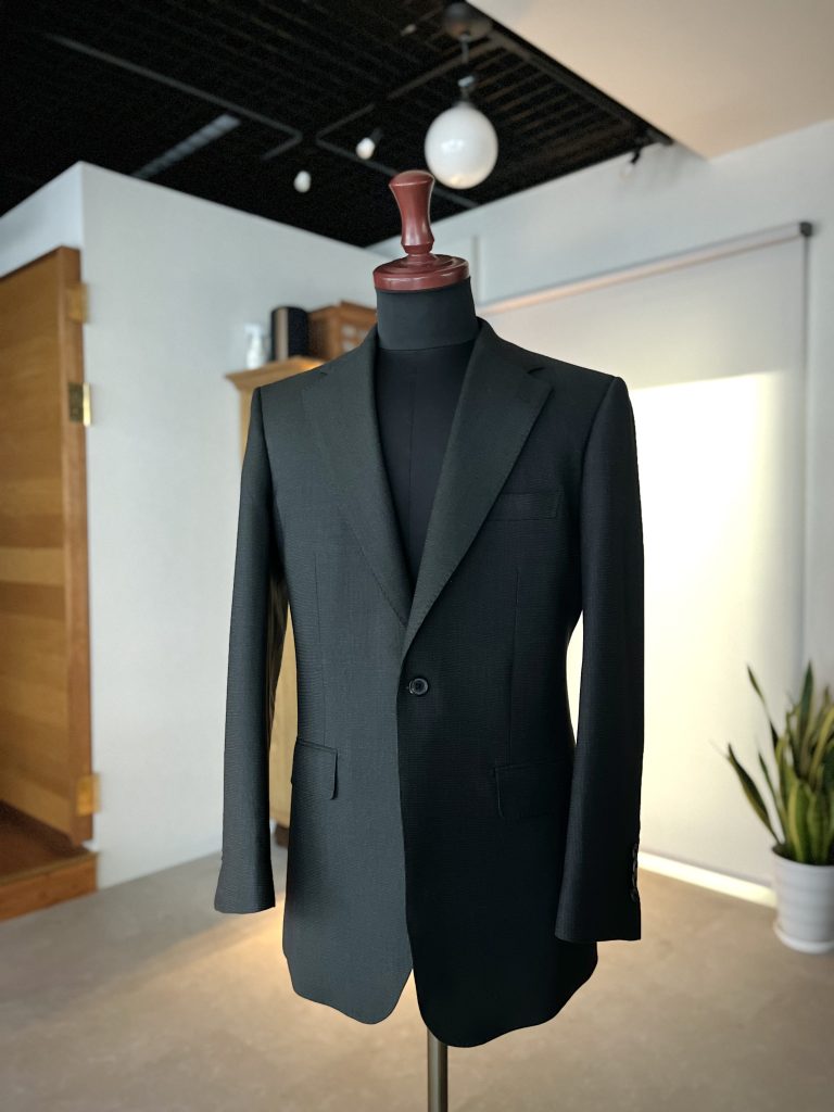 トラディショナルとモダンが介在する生地を、額面通り仕立てに反映させるべく、フロントは1釦を採用しラペル幅はややワイドに。そしてフロントカットを遅逃げさせることでクラシックさを演出。