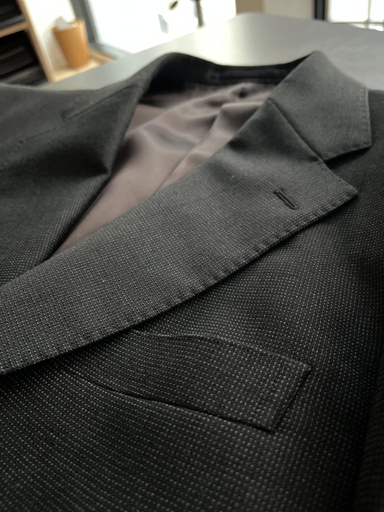 服地の物性を活かすべく、MTM – F のお仕立てコースで採用する一番柔らかいフルキャンバスを使用してドレープ感に敬意を払いました。