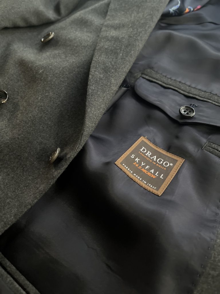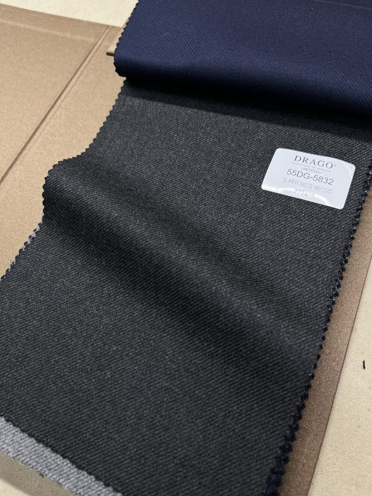 S140’s 以上の原毛を扱う紡績企業としてはトップシェアを誇るイタリアを代表する紡績会社であり、その糸を自社で織り上げる一貫紡でもあるドラゴのコレクションから SKYFALL を採用しました。