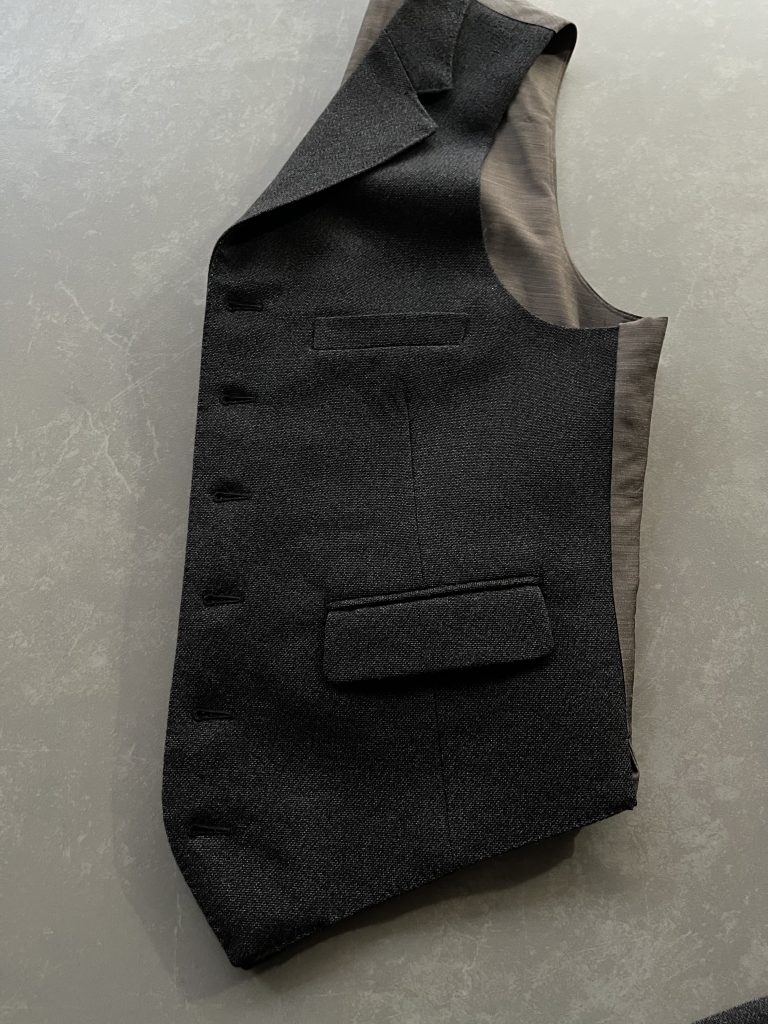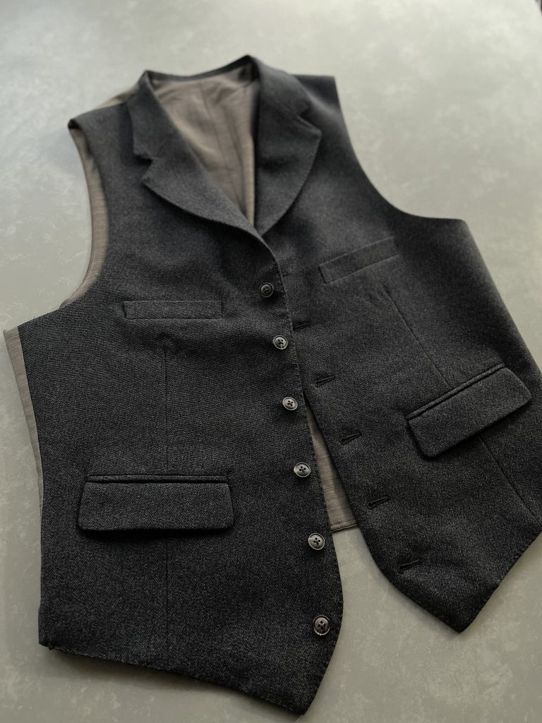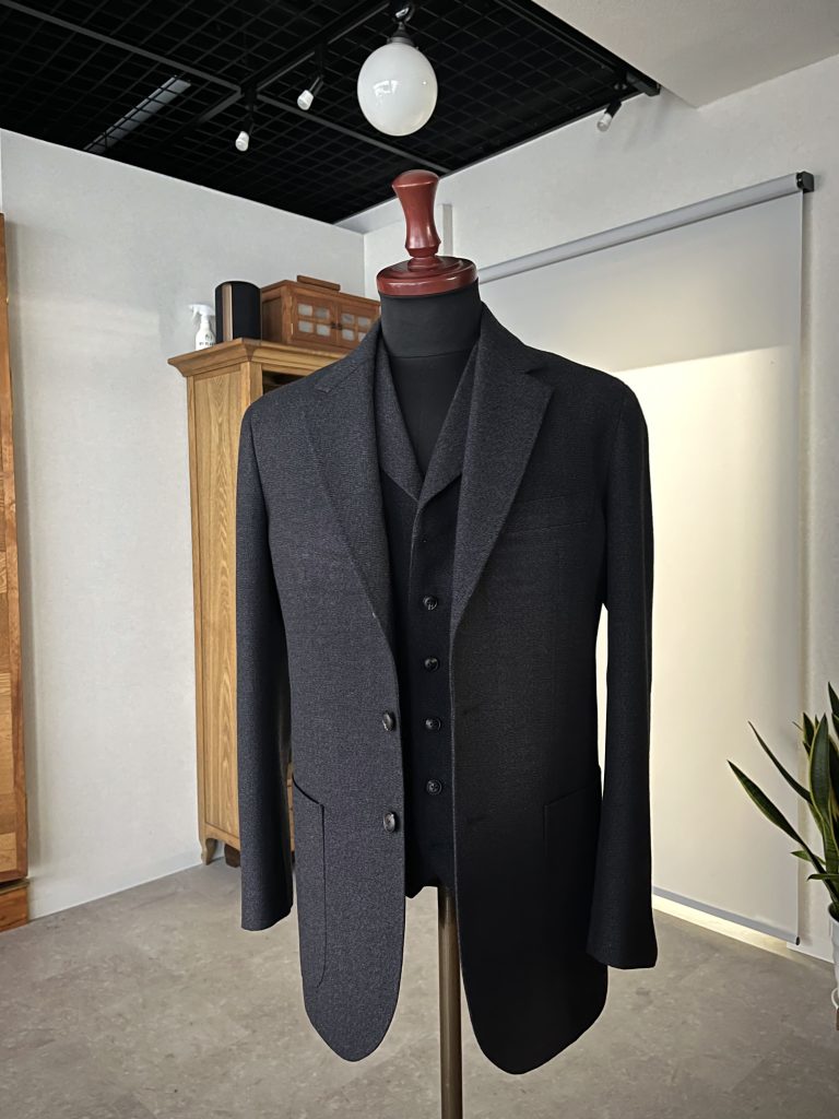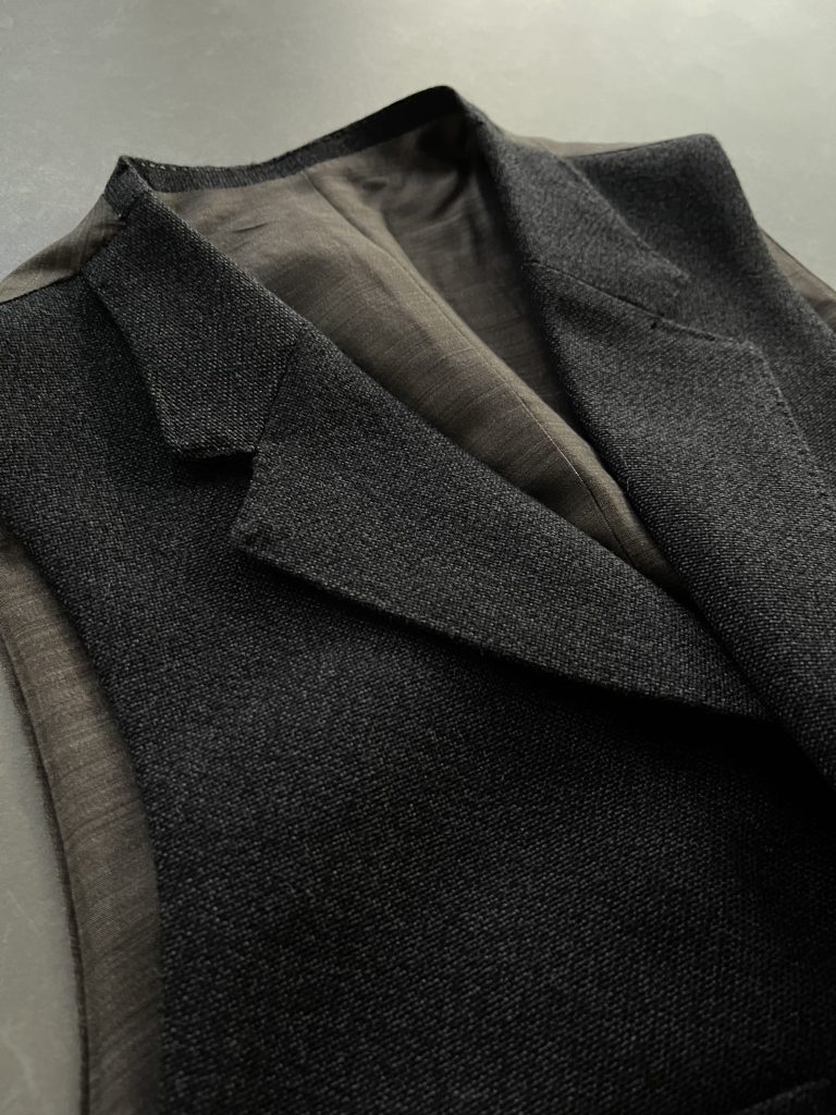 いかなる時期も3ピースでのお仕立てがマストのお客様に新たな一手として、初めて襟付きウエストコートをご提案。