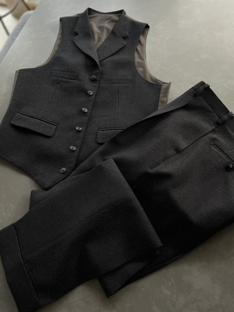 スーチングではありますが、ジャケット・ウエストコート・トラウザーズそれぞれが独立してお使い頂く余地を残すことで、服地の世界観に配慮を示しました。